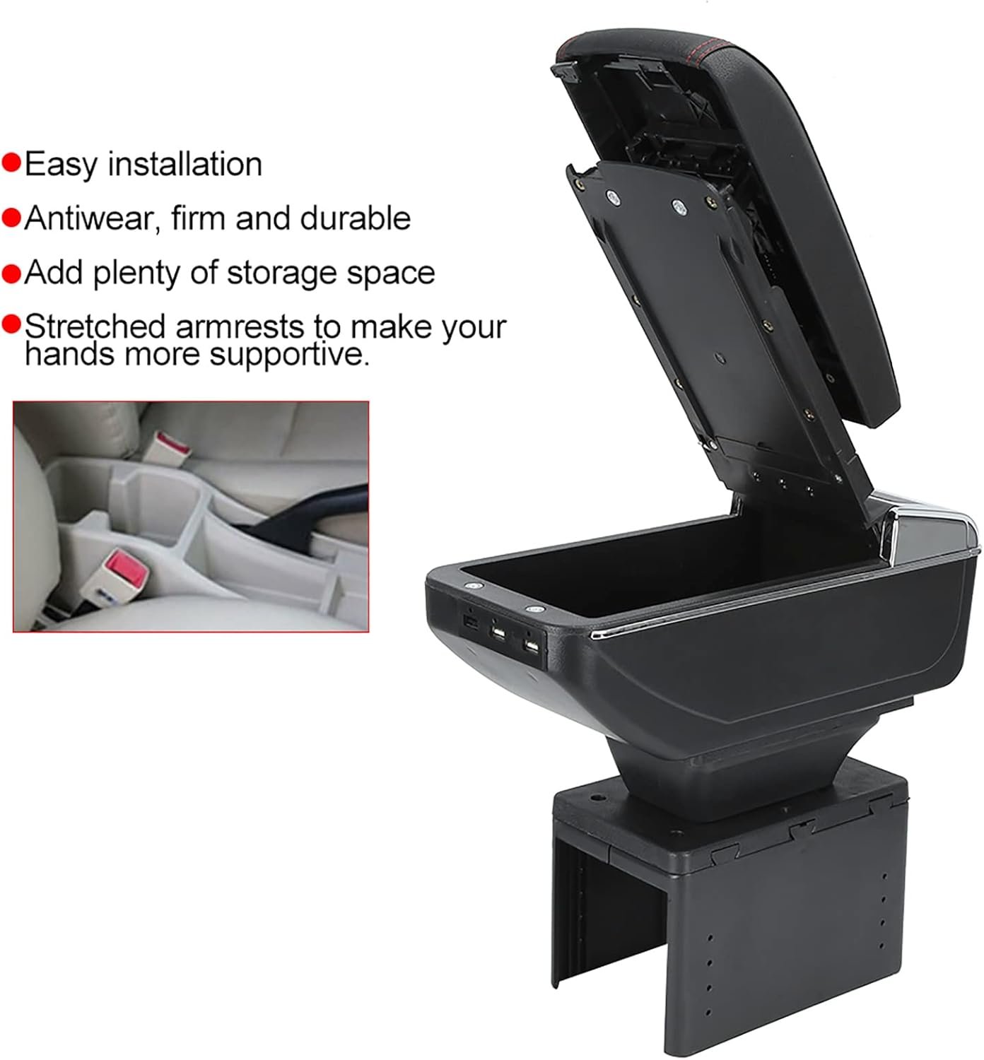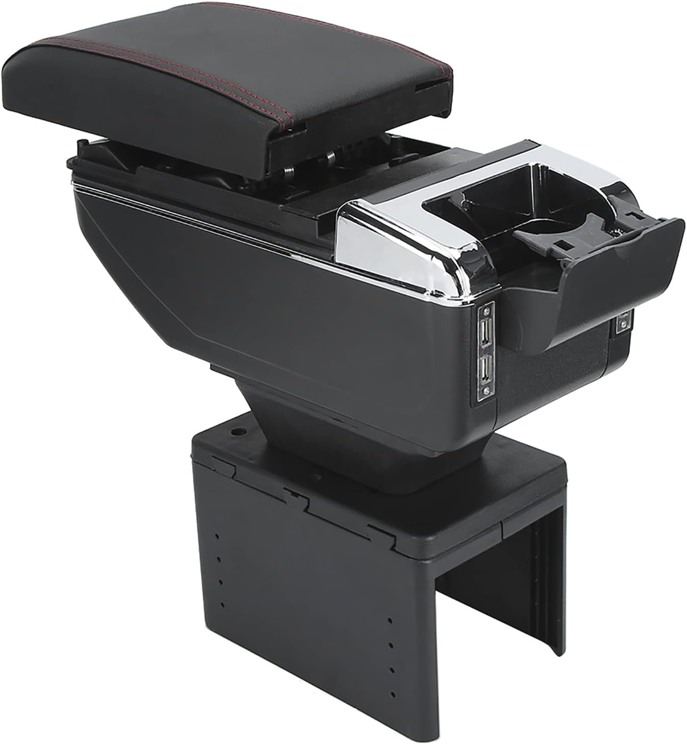 This armrest box features dual USB charging ports, allowing you to charge two devices simultaneously. It provides comfortable arm support during long drives along with extra storage space for your essentials. The universal design ensures easy installation and compatibility with most small and mid-sized cars.