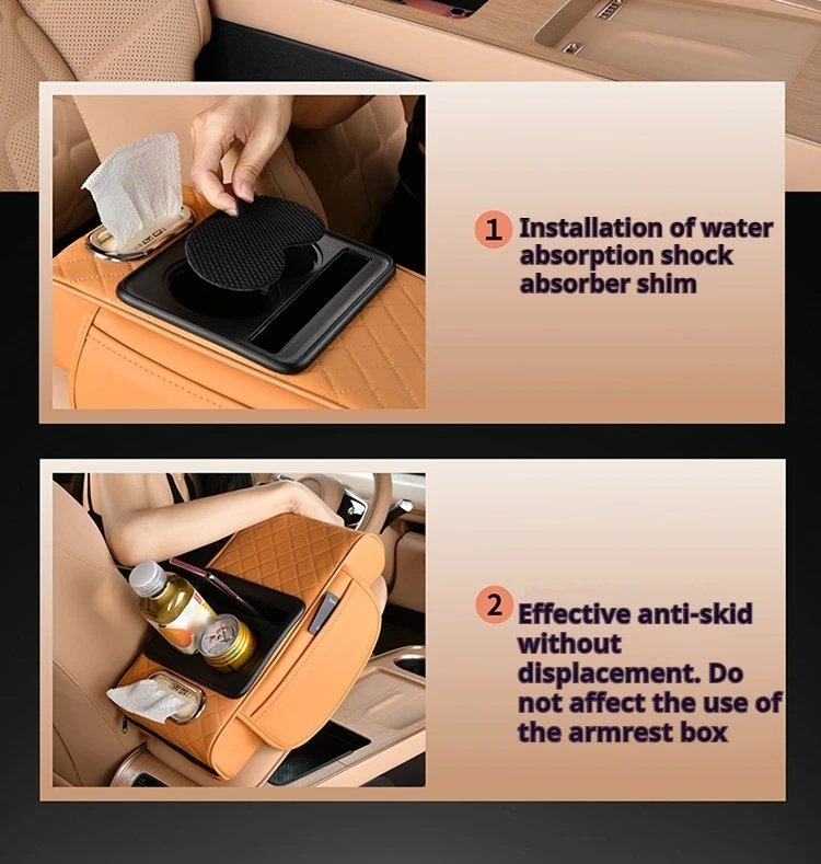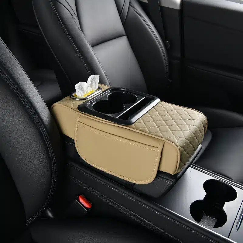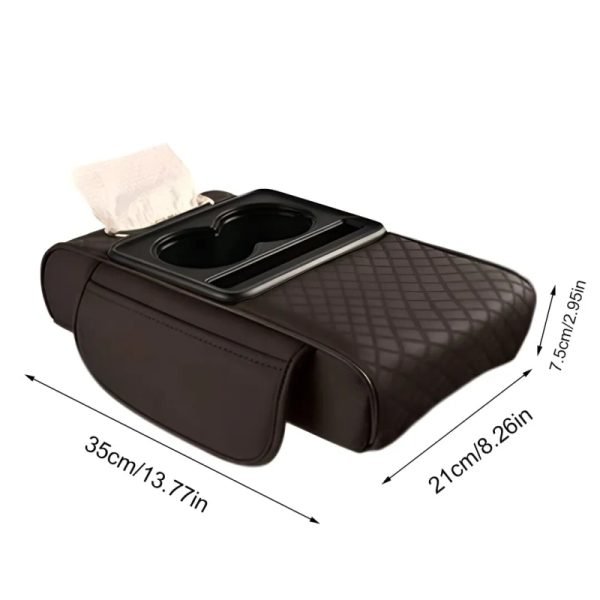 It features a built-in storage box and cup holder, allowing you to conveniently store your mobile phone, keys, cards, tissues, or beverages. The premium leather finish and cushioned padding add an elegant and luxurious touch to your car’s interior.